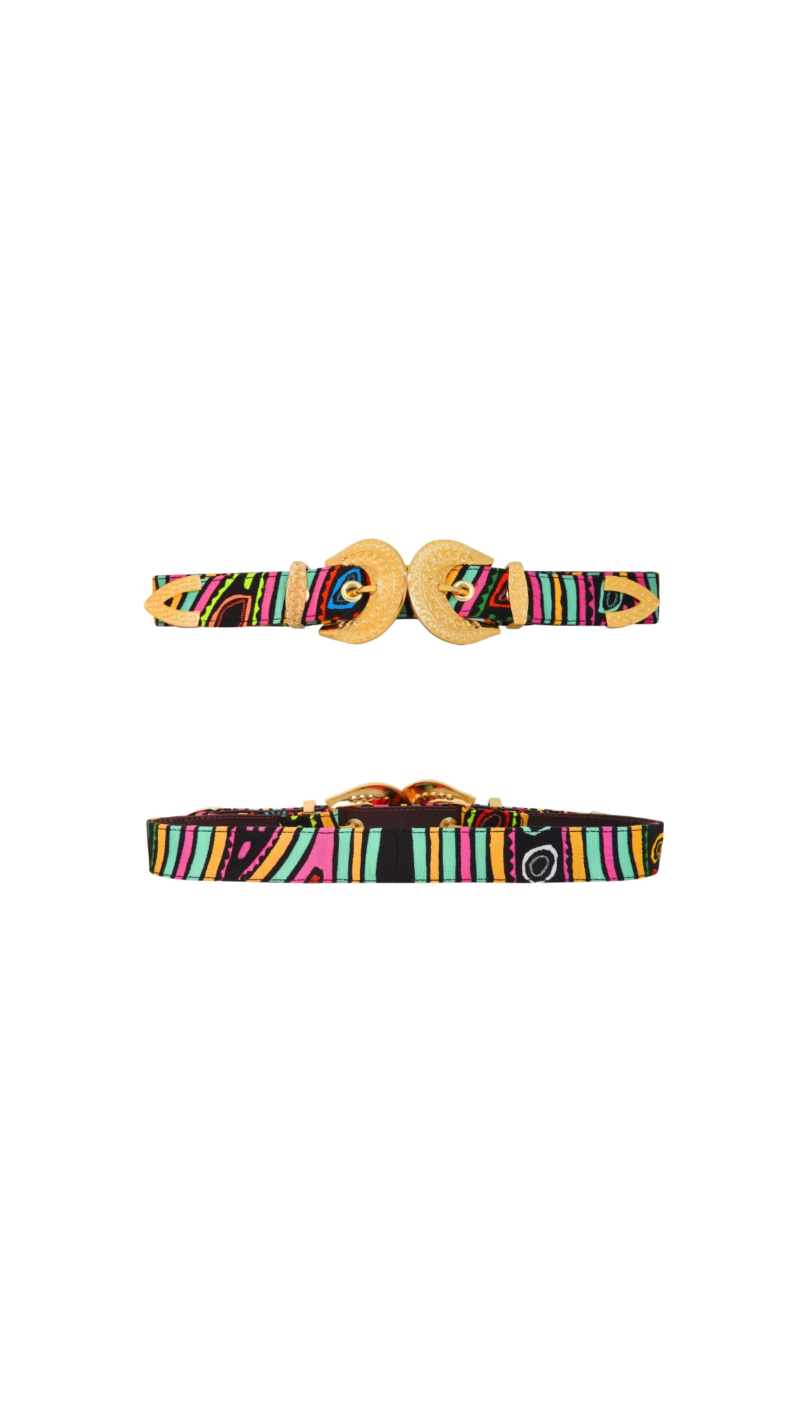 Composée d’un tissu de coton multicolore appelé « mola », de cuir de veau sans chrome et de deux boucles sophistiquées en laiton plaqué or 24k ou argent, cette ceinture s’inspire de la culture Kuna, dont les croyances et les traditions sont illustrées dans chaque « mola », qu’il s’agisse d’animaux colorés, de scènes de la vie quotidienne ou de motifs abstraits.